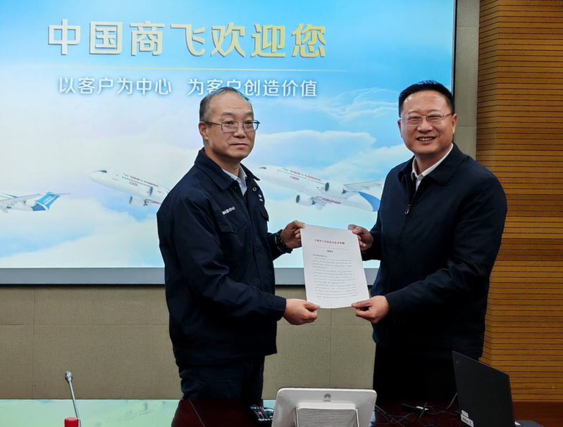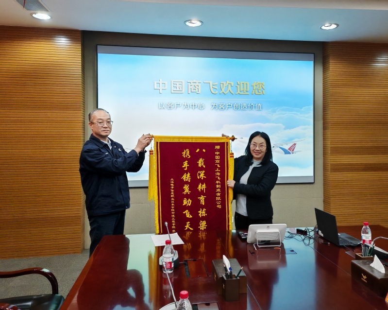 上海飞机制造有限公司作为承载民族航空梦想的核心企业,多年来与我校保持着紧密的校企合作关系。张涛代表学校向企业递交了感谢信,字里行间饱含对企业支持职业教育发展的诚挚谢意。信中提到,自2018年以来,学校已向该公司输送200余名优秀毕业生,他们在“航空强国”的一流平台上成长成才,这离不开企业提供的优质实践平台、悉心指导与高度信任。同时,调研团队向企业赠送锦旗,锦旗上“八载深耕育栋梁 携手铸翼助飞天”的字样,凝结了双方合作的初心与愿景。